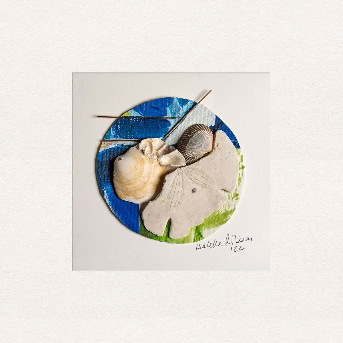 Abstract coastal themed framed art print by Annapolis artist, Carey Crane, called "Vistiation" suggests the movement of sea life floating sea plants fish and botanical forms in painted pastel tones of tan, grey, ivory, green, rust and peach.