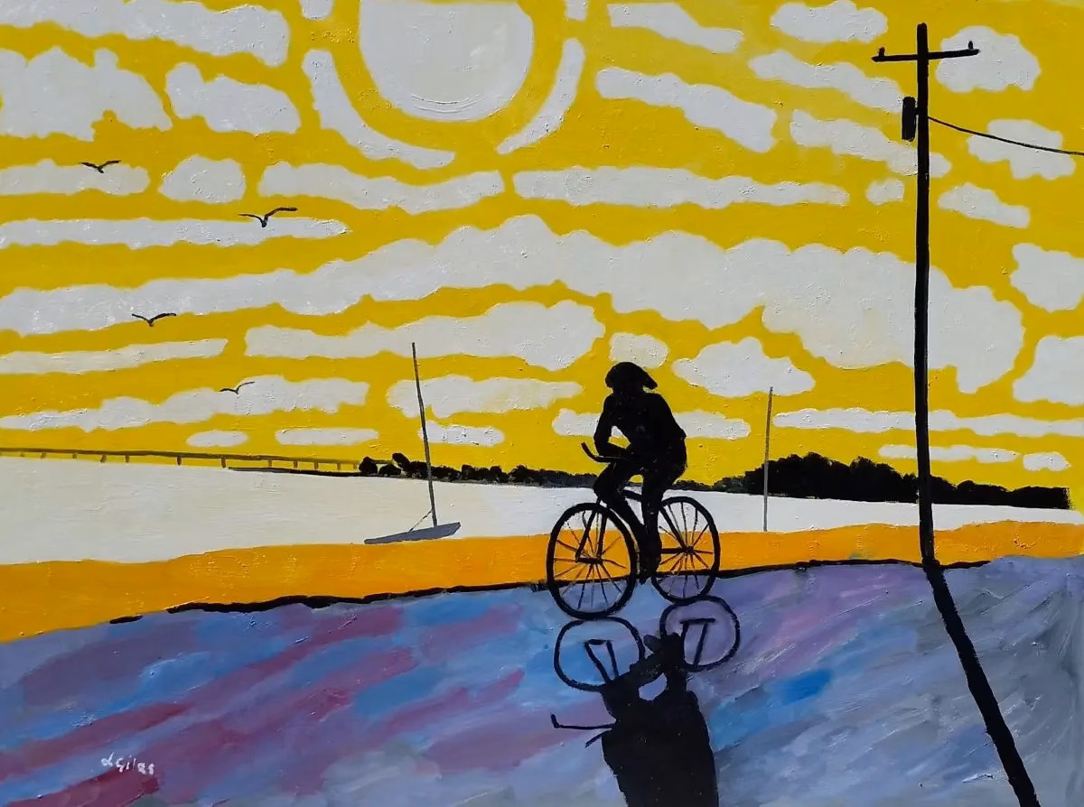 "Summer Day" is a close up view through marsh grasses catching the motion of water surrounding the vibrant greens and yellows of a summer marsh. Close perspective to invite the viewer into the lushness of the marsh by artist Geo McElroy.