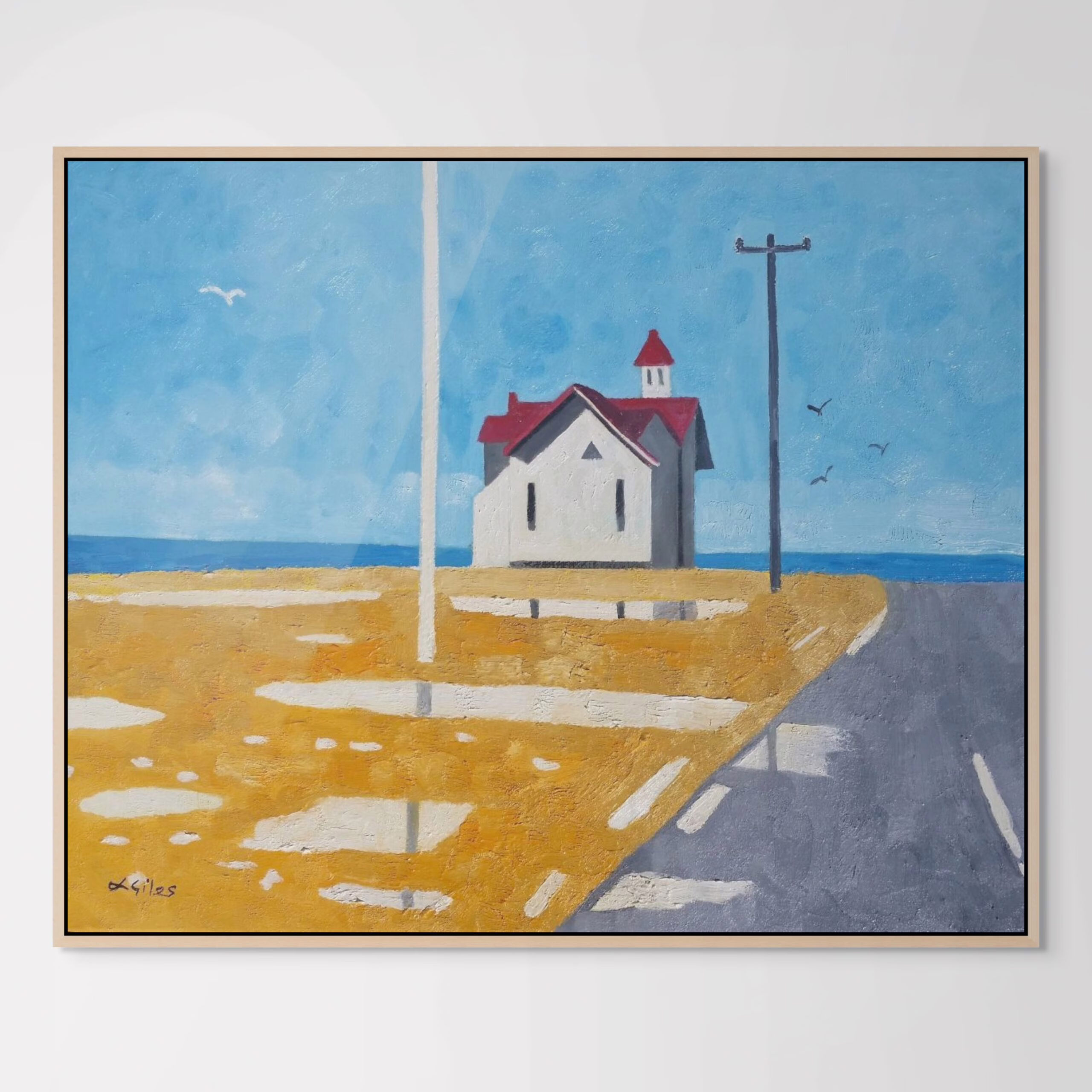 British artist Lesley Giles is known primarily for her colorful, coastal landscape paintings. They portray her fascination with water, sky, washing lines floating in the wind and solitary buildings. A figurative artist, her style is formalized with a wave to abstraction. Originally from London, Lesley now paints in her studio overlooking the Choptank River on the Eastern Shore, Maryland, where she explores the effect of development on our landscapes and the beauty in the ordinary.