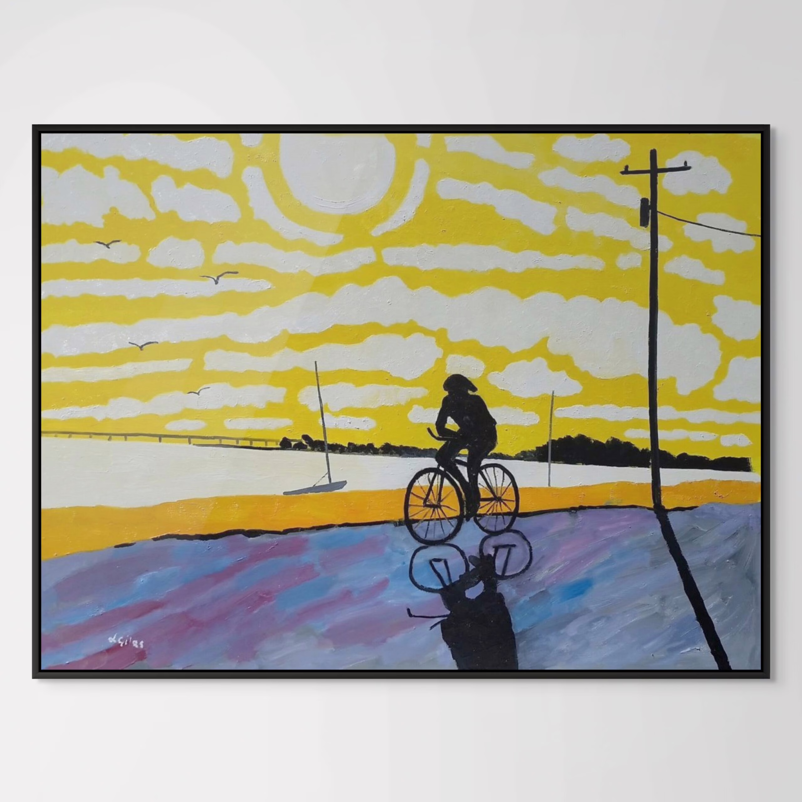 British artist Lesley Giles is known primarily for her colorful, coastal landscape paintings. They portray her fascination with water, sky, washing lines floating in the wind and solitary buildings. A figurative artist, her style is formalized with a wave to abstraction. Originally from London, Lesley now paints in her studio overlooking the Choptank River on the Eastern Shore, Maryland, where she explores the effect of development on our landscapes and the beauty in the ordinary.